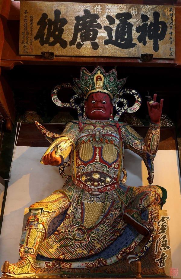 両側は四天王です。高さ8メートルで、それぞれ鎧(よろい)を着ています。俗称は四大金剛です。そのうち、二人は威厳のある様子をしており、他の二人は温和でやさしく見えます。東方天王は提多羅吒(だいたらた)という名で、中国語訳の持国(じこく)の通り、国土を守り、帝释天(たいしゃくてん)の主楽神です。彫像は白色で、琵琶を手に持ちながら、諸(もろもろ)の神将(神のように優れた将軍たち)を率いて東勝神洲(とうしょうしんしゅう)の人々を守っています。南方天王は毘嚧陀迦(びるだか)という名で、中国語訳の増長(ぞうちょう)の通り、人々に善根(ぜんこん<善を行おうとする心根>)を増長させることを司(つかさど)ります。彫像は青色で、剣を手に持ち、諸(もろもろ)の神将を率いて南瞻部洲(なんせんぶしゅう)の人々を見守っています。西方天王は毘留博叉(びるはくしゃ)という名で、中国語訳の広目(こうもく)の通り、淨眼(じょうがん<きれいですんだ目>)を以って護持することを司ります。彫像は赤色で、手の中に竜が巻きついており、諸竜を率いて西牛貨洲(さいごけしゅう)の人々を見守っています。北方天王は毘沙門(びしゃもん)という名で、中国語訳の多聞(たもん)の通り、大きな福德(ふくとく<幸福な運命と徳の行い>)があり、人々の財産を護持することを司ります。彫像は緑色で、右手と左手にそれぞれ傘や銀の鼠を持って北俱蘆洲(ほっくるしゅう)の人々を守護しています。