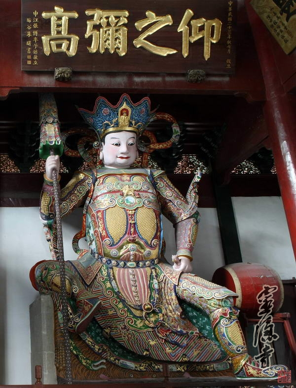 まん中の神棚に供養してある弥勒菩薩は、胸を露(あらわ)にニコニコしながら、蒲団に正座しています。裏側の神棚に供養してあるのは、仏教の護法である韋駄天です。楠(クスノキ)で作られ、高さ約2.5メートルあります。威厳があり、はつらつとしています。この彫像は南宋時代から伝わったもので、今ではすでに八百年あまりの歴史があります。